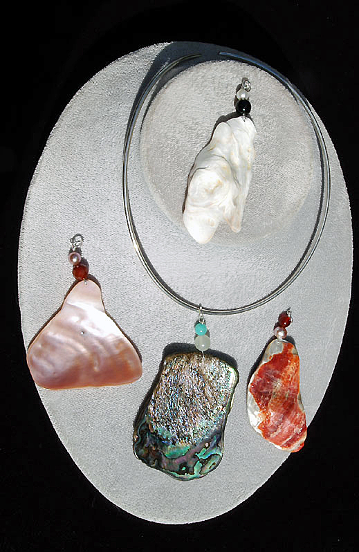 Your choice of select shell pendants on a sterling silver coated neckwire. No two pendants are the same. Complemented with sterling silver findings and semi-precious stones. Contact seller for your choice of shell species including (but not limited to): Red Abalone; Black or Gold Lip Mussel; Paua; Pink Lip Mussel and many more species from which to choose. Set includes one pendant and one sterling silver coated neckwire.Price: $30.00