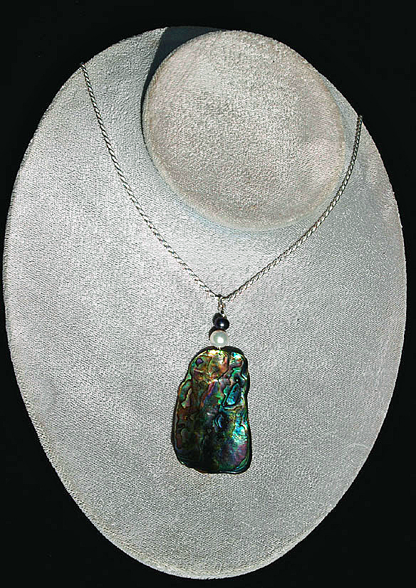 Paua pendant on sterling silver chain complemented with sterling silver findings and semi-precious stones. No two are exactly alike.Price: $30.00