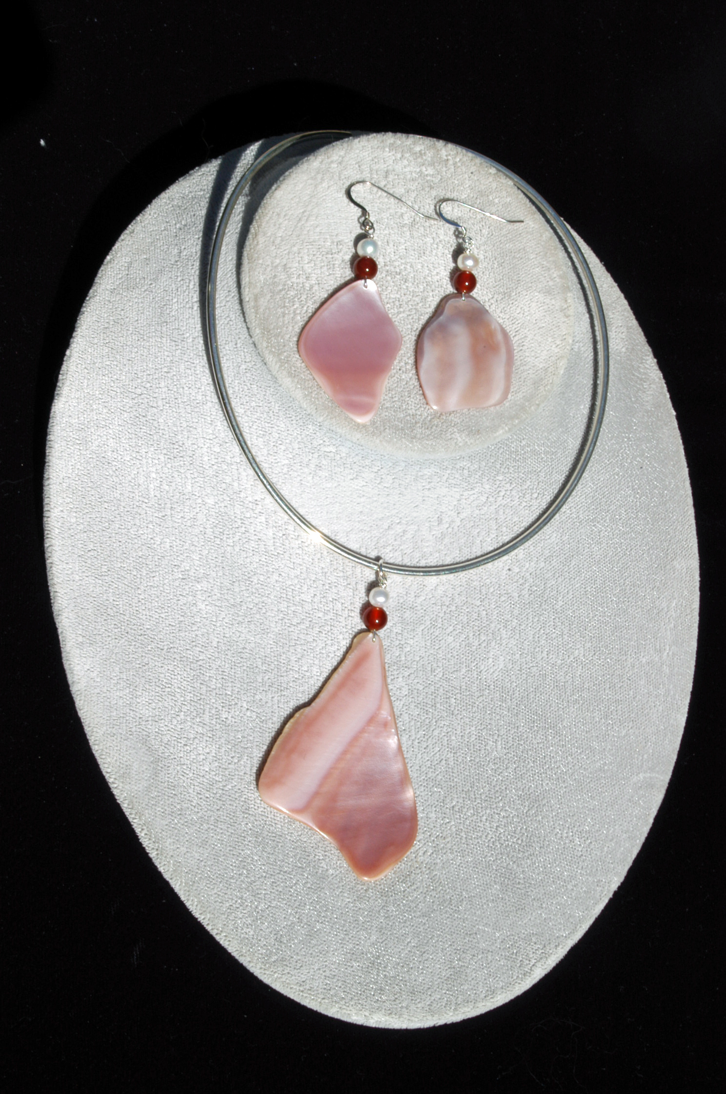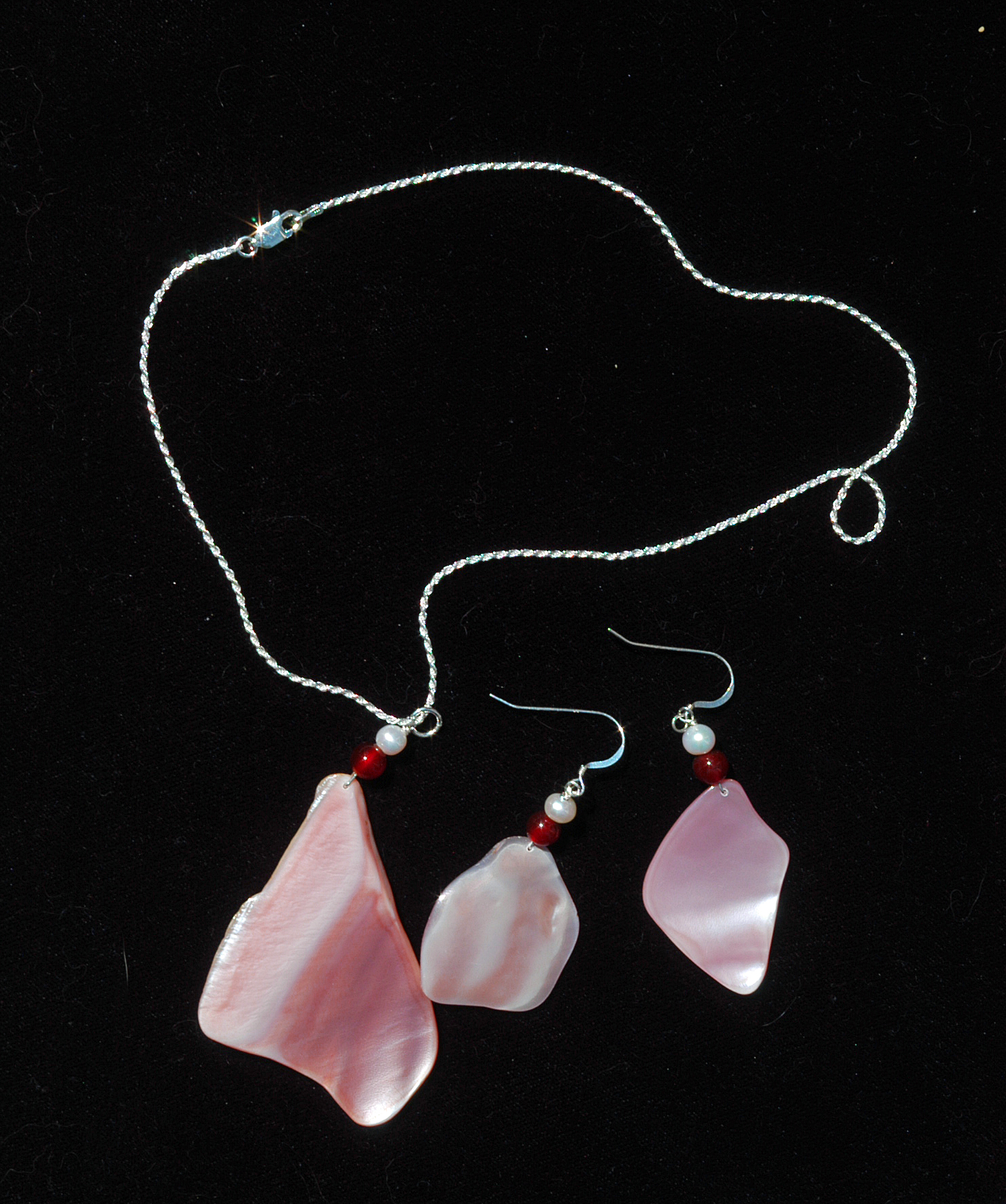Pink Lip Mussel Necklace and Earring set... with sterling silver chain... complemented by sterling silver findings... semi-precious stones. No two sets are alike. Shells are from the Cook Islands.Price: $49.00