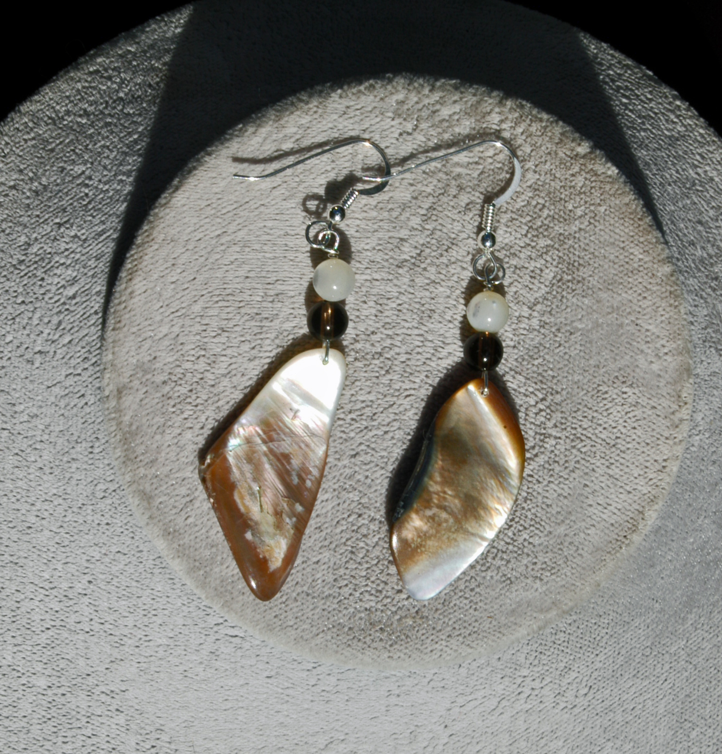 Black or gold lip oyster earrings. Complemented with sterling silver findings and semi-precious stones. No pair are exactly the samePrice: $22.00