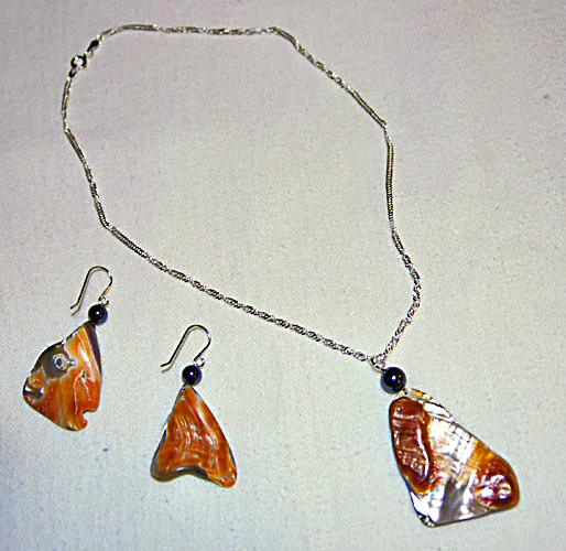 Red abalone pendant on sterling silver chain with matching earrings. No two sets are alike. Complemented with sterling silver findings and semi-precious stones.Price: $49.00